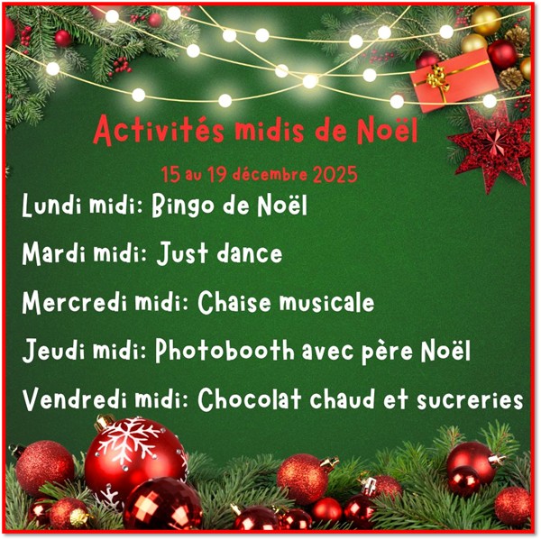 Nous sommes heureux de vous informer que, pour souligner la semaine de Noël, des activités spéciales seront organisées tous les midis, du 15 au 19 décembre.